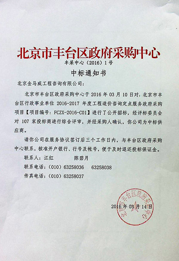 3月10日,北京市豐臺區(qū)行政事業(yè)單位2016-2017年度工程造價(jià)咨詢定點(diǎn)服務(wù)政府采購項(xiàng)目(項(xiàng)目編號:FCZX-2016-C01)進(jìn)行了公開招標(biāo),據(jù)悉,一共有107家工程造價(jià)咨詢公司參與了投標(biāo),我公司經(jīng)評標(biāo)委員會的綜合評審,并經(jīng)采購人確認(rèn),為此項(xiàng)目中標(biāo)供應(yīng)商。